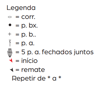 Abreviaturas: corr.: Correntinha. p.bx: ponto baixíssimo. p.b.: ponto baixo. p.a.: ponto alto. ag.: agulha. rep.: repita. trab.: trabalhe. v.: vezes. aum.: aumento. un.: unidade. acomp.: acompanhando. nov.: novelo.