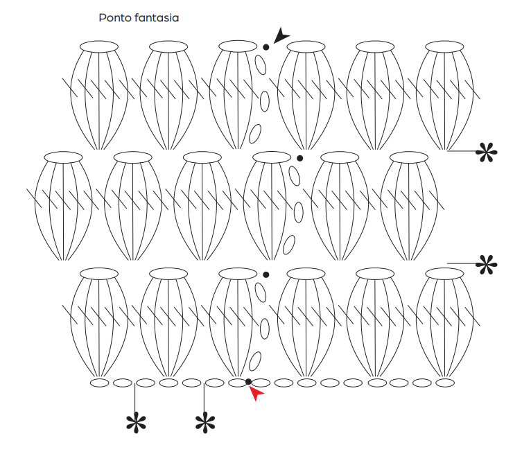 Amostra: Um quadrado de 10 cm em p. fantasia seguindo o gráfico (de * a *) com a ag. nº 3,5mm = 9 p. x 8 carr..