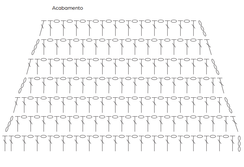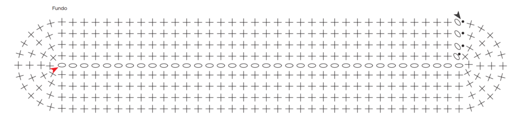 Pontos utilizados: Correntinha (corr.). Ponto baixíssimo (p. bx.): Introduza a ag., laç., puxe o p. e passe diretamente no p. da ag.. Ponto baixo (p. b.): introduza a ag. laç., puxe o p. e com outra laç., rem. todos os p.. Ponto alto (p. a.): laç., introduza a ag., laç., puxe o p. laç., rem., 2 p. e com outra laç., rem. todos os p.. Fundo: siga o gráfico. Acabamento: siga o gráfico. Ponto fantasia: siga o gráfico.