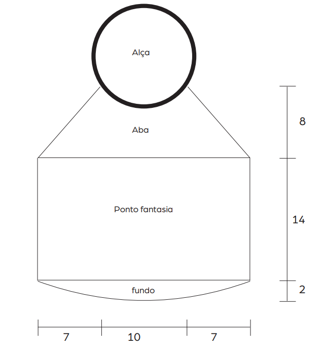Comece pelo fundo – Com o fio Encanto cor 8176 (Off-White), faça uma corr. de 36 p. mais 1 corr. para virar e trabalhe o fundo da bolsa seguindo o gráfico. Terminado o gráfico, faça a toda a volta do fundo uma carr. em p. b., pegando o p. somente na alça de trás do p. b. da carr. anterior. Com o fio Encanto cor 8176 (Off-White), continue em círculo e em p. fantasia seguindo o gráfico, repita de * a * no sentido dos p. (42 v.). A 14 cm, trabalhados em p. fantasia, separe o trabalho em duas partes iguais e continue cada parte separadamente. Oriente-se pelo fundo para que fique as pontas arredondadas do fundo nas laterais. Em seguida trabalhe em metade dos p. o acabamento seguindo o gráfico. Terminado o gráfico, termine com 1 carr. em p. b.. Deixe a alça entre os p. b. da última carr.. Pingente – Base – Com o fio Encanto cor 8176 (Off-White), faça uma corr. de 4 p. (ou anel mágico) feche em círculo e trabalhe do seguinte modo: 1ª carr. 8 p. b. no círculo. 2ª, 3ª, 4ª e 5ª carr. 16 p. b.. Em seguida faça uma carr. a toda volta em p. bx. e rem.. Franjas – Corte 46 fios, Encanto cor 8176 (Off-White), com aproximadamente 60 cm de comprimento cada fio. Amarre todos os fios no centro, deixe uma sobra do fio ao marrar para prender o pingente. Dobre os fios ao meio, enrole 2 vezes um fio bem junto da dobra e amarre bem firme para não soltar. Em seguida introduza a ponta do fio em que amarrou os fios para dentro da base, puxe até a base cobrir todos os fios. Rem. o fio usado para puxar os outros fios, entre os p. da base.