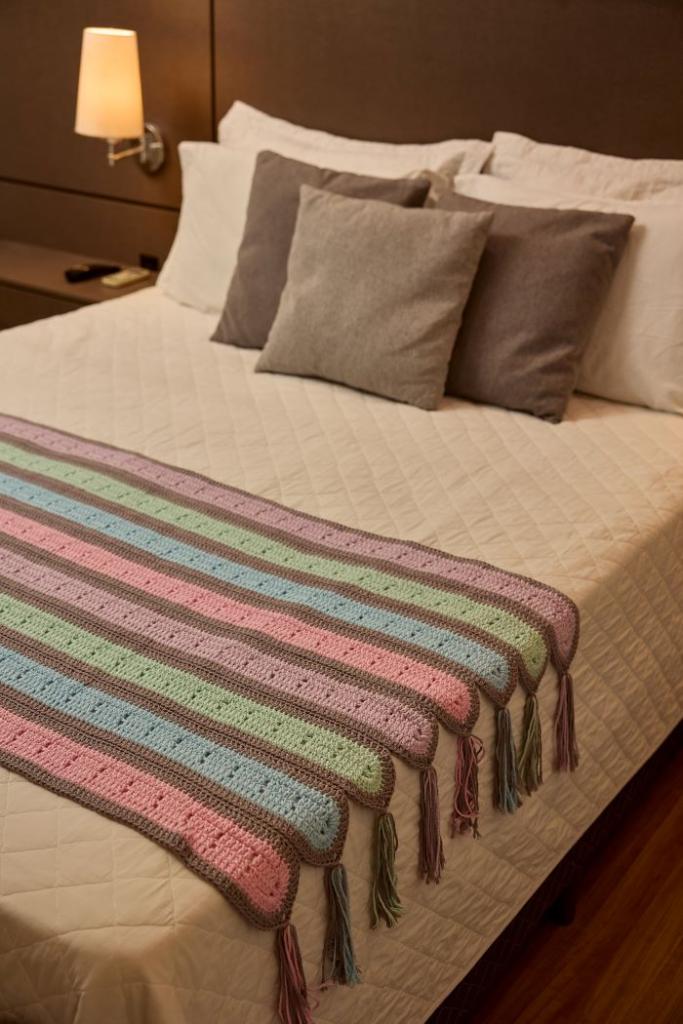 Neste post, você vai aprender mais sobre a confecção dessa peça versátil, que pode ser usada tanto como manta quanto como peseira, valorizando camas, sofás e poltronas. Um projeto perfeito para quem ama decoração artesanal, deseja criar peças elegantes e ainda explorar combinações de cores suaves e atemporais. Prepare suas agulhas e venha se inspirar nesse crochê que é puro aconchego! ✨