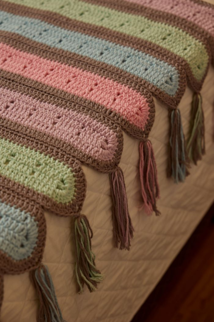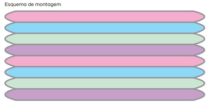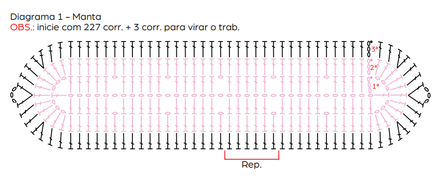 Manta: com o fio Barroco Maxcolor 4/6 na cor Rosa-Candy, inicie com 227 corr. + 3 corr. para virar o trab., 1ª carr.: volte trab. a partir da 4ª corr. a contar da ag. com 4 p.a., * 1 corr., pule 1 p. de base, 5 p.a., * rep. de *a* até mais 36 v., na última corr. de base trab. 3 corr., 1 p.a. no mesmo p. de base, 3 corr., 1 p.a. no mesmo p. de base, volte trab. do lado oposto com 4 p.a., * 1 corr., pule 1 p. de base, 5 p.a. * rep. de *a* mais 36 v., na última corr. trab. 3 corr., 1 p.a. no mesmo p. de base, 3 corr., feche com p.b.x. 2ª carr.: inicie com 3 corr., * trab. a lateral com 1 p.a. para cada p. de base, 5 p.a. sobre as 3 corr. de base, 1 p.a. sobre o p.a. de base, 5 p.a. sobre as 3 corr. de base, * rep. de *a* do lado oposto da peça, feche com p.b.x. Cont. acomp. o diag. 1, trab. em carr. circulares. Faça 8 peças iguais, sendo 2 com fio Barroco Maxcolor 4/6 na cor Rosa-Candy, 2 com fio Barroco Maxcolor 4/6 na cor Lilás-Candy, 2 com fio Barroco Maxcolor 4/6 na cor Azul-Candy e 2 com fio Barroco Maxcolor 4/6 na cor Verde-Candy.
