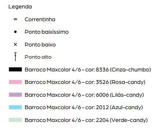 Amostra: um quadrado de 10 cm, feito em p.a., com Barroco Maxcolor 4/6 e ag. 3,5 mm = 15 pts. x 7 carr.