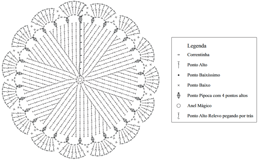 Abreviações:p. (Ponto), pts. (pontos), trab. (trabalhe ou trabalhando), ag. (agulha), rep. (repetição ou repetições), rem. (rematar), acomp. (acompanhando), corr. (Correntinha), p.b.x. (Ponto Baixíssimo), carr. (Carreira); laç. (Laçada); p.b. (Ponto Baixo), p.a. (Ponto Alto), p.p. (Ponto Pipoca com 4 pontos altos), p.a.r.t. (Ponto Alto em Relevo pegando por trás).