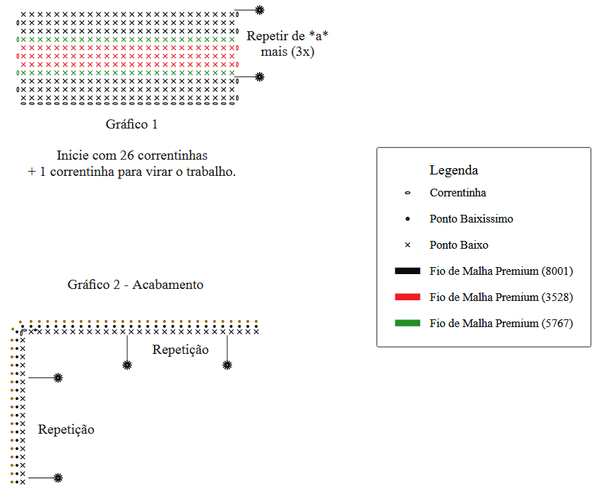 Pontos Utilizados: corr. (Correntinha); p.b.x. (Ponto Baixíssimo); p.b. (Ponto Baixo).