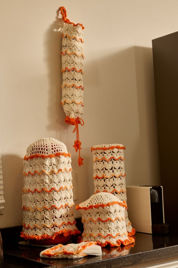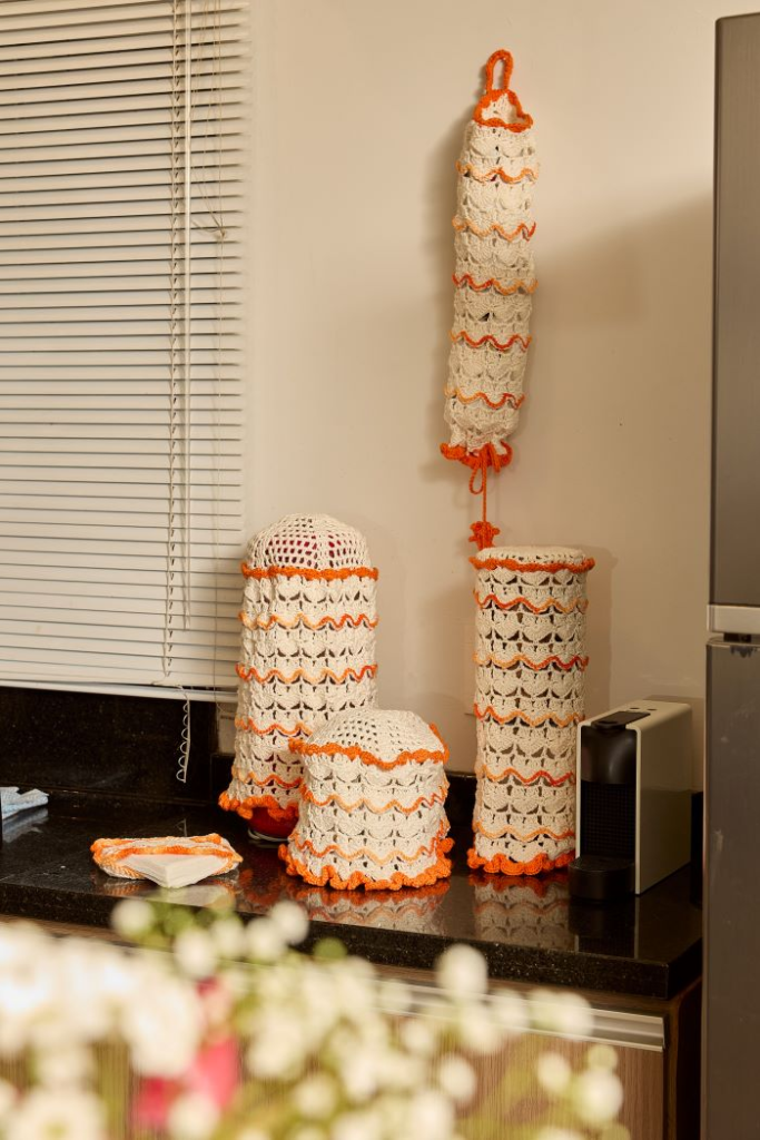 Neste especial, o Ateliê Círculo apresenta um conjunto completo que transforma a cozinha em um ambiente ainda mais acolhedor e sofisticado. O jogo é composto por capa para garrafa térmica/liquidificador, capa de torradeira, capa de cafeteira, puxa saco e porta guardanapo, peças que além de decorativas, também ajudam a organizar o espaço com muito estilo.