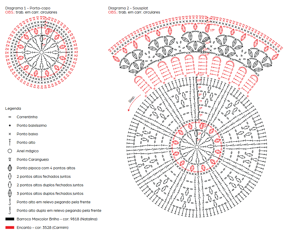 Porta-copo: com o fio Barroco Maxcolor Brilho na cor Natalina, inicie com um am. 1ª carr.: inicie com 3 corr., 11 p.a., feche com p.b.x. 2ª carr.: inicie com 4 corr. 1 p.a.d. no mesmo p. de base, 2 corr., * 2 p.a.d.f.j. no mesmo p. de base, 2 corr., * rep. de *a* mais 10 v, feche com p.b.x, rem. 3ª carr.: emende o fio Encanto sobre as 2 corr. de base, trab. o p.p. inicial com 3 corr. + 3 p.a. (dando um total de 4 pts.), 3 corr., pule 1 p. de base, * sobre as 2 corr. de base trab. 1 p.p., 3 corr., pule 1 p. de base, * rep. de *a* mais 10 v., feche com p.b.x. Cont. acomp. o diag. 1, trab. em carr. circulares, realizando as trocas de cores. Faça 2 peças iguais. Sousplat: com o fio Barroco Maxcolor Brilho na cor Natalina, inicie com um am. 1ª carr.: inicie com 3 corr., 11 p.a., feche com p.b.x. 2ª carr.: inicie com 4 corr. 1 p.a.d. no mesmo p. de base, 2 corr., * 2 p.a.d.f.j. no mesmo p. de base, 2 corr., * rep. de *a* mais 10 v, feche com p.b.x, rem. 3ª carr.: emende o fio Encanto sobre as 2 corr. de base, trab. o p.p. inicial com 3 corr. + 3 p.a. (dando um total de 4 pts.), 3 corr., pule 1 p. de base, * sobre as 2 corr. de base trab. 1 p.p., 3 corr., pule 1 p. de base, * rep. de *a* mais 10 v., feche com p.b.x. Cont. acomp. o diag. 1, trab. em carr. circulares, realizando as trocas de cores, até a 10ª carr., rem. 11ª carr.: emende o fio Encanto na cor Carmim, 1ª carr.: * inicie com 1 p.b., 9 corr., volte trab. a partir da 5ª corr. a contar da ag. com 5 p.a., pule 2 pts. da carr. de base, * rep. de *a* mais 39 v., feche com p.b.x., rem. Cont. acomp. o diag. 2, trab. em carr. circulares, realizando as trocas de cores, rem. Faça 2 peças iguais.