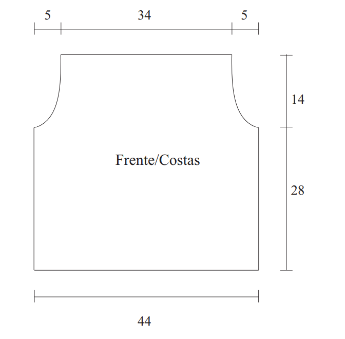 Frente e Costas – São iguais. Monte 70 p. nas ag. nº 7,0mm e tric. em p. meia. A 28 cm do início do trabalho para as cavas rem. de cada lado cada 2 carr.: 4 p., 2 p. e 1 p. (2 v.). A 42 cm do início do trabalho rem..