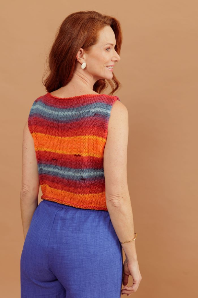Desenvolvida pela artesã Gorete Andrade, a peça é confeccionada com o Fio Batik da Círculo, que cria um efeito mesclado vibrante e automático, formando listras coloridas sem a necessidade de trocar de fio. O resultado é uma regata leve, confortável e com visual marcante — ideal para os dias mais quentes ou para compor looks criativos em qualquer estação.
