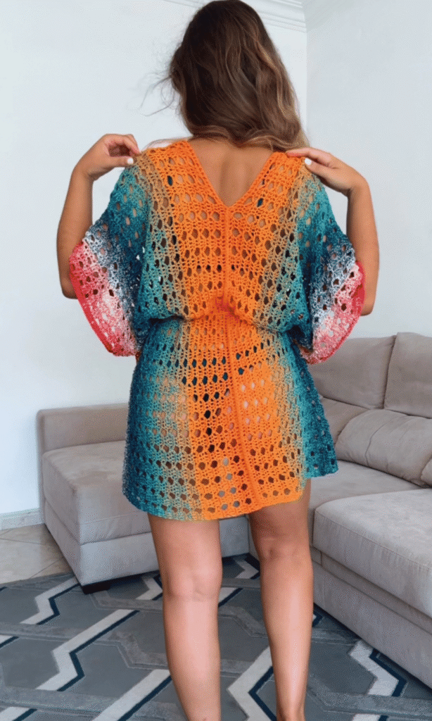 A Saída de praia de crochê é Leve, colorida e cheia de movimento, a definição perfeita de verão. Com caimento soltinho, decote em V e um vibrante efeito degradê, a peça une conforto e estilo, sendo ideal para usar sobre biquínis ou maiôs em dias de sol, praia ou piscina.
