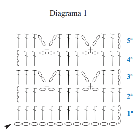 - Vire, suba 3 corr., 2 p.a., 2 corr., no próximo espaço de 2 corr. da carreira anterior coloque 1 p.b., 2 corr., e siga com: 3 p.a., 2 corr.,1pb, 2corr…, – repita este padrão até ao final da carreira.
