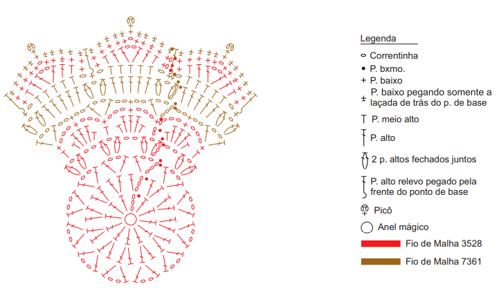 Confecção (2x): com o fio na cor carmim, faça um anel mágico e siga o gráfico ou receita abaixo.